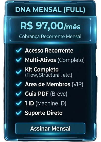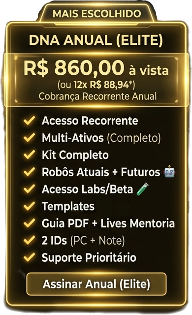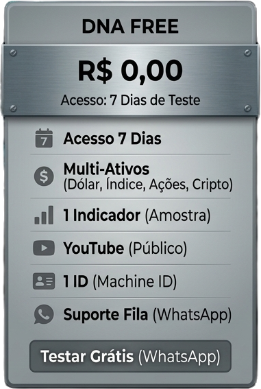 Aviso: O Indicadores DNA desenvolve softwares e algoritmos de automação voltados exclusivamente para facilitar a visualização e interpretação de dados de mercado através de indicadores plotados em tela. Nossos produtos são ferramentas tecnológicas (plug-ins) que operam em plataformas de terceiros (Sistemas Nelogica/TradingView/NinjaTrader/MetaTrader). Salientamos que o Indicadores DNA não atua como corretora, consultoria ou intermediária de valores mobiliários, não realiza recomendações de investimento e não se responsabiliza por quaisquer resultados financeiros decorrentes do uso das ferramentas. O mercado financeiro envolve riscos e o desempenho passado não é garantia de resultados futuros.